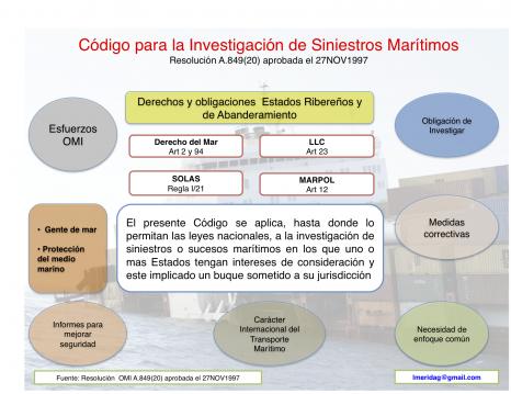 La investigación y el correcto análisis de los accidentes marítimos está regulado en el ámbito internacional por el Código para la Investigación de Siniestros y Sucesos Marítimos, aprobado mediante la promulgación de laResolución A.849(20) de la Organización Marítima Internacional, el 27 de noviembre de 1997.