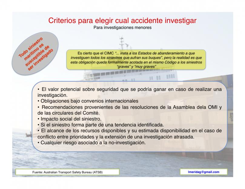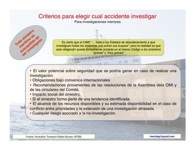 El Código otorga una nueva dimensión a las investigaciones que las administraciones marítimas deben llevar a cabo. Establece la obligatoriedad de las investigaciones, así como de la publicación de los resultados de las mismas de manera tal que se puedan capitalizar las enseñas y así evitar que los accidentes se repitan.