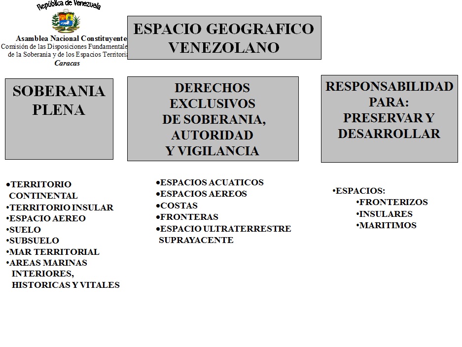 El capítulo sobre el Espacio Geográfico de la República, fue redactado en estricta observancia del derecho internacional y los tratados, laudos y convenios no viciados de nulidad, y al mismo tiempo agregando de manera soberana y firme, una redacción que permita su fácil comprensión hasta para el más común de los Venezolanos y manteniendo el carácter de áreas marinas históricas y vitales y el derecho ineludible e incuestionable del Estado sobre estos espacios.