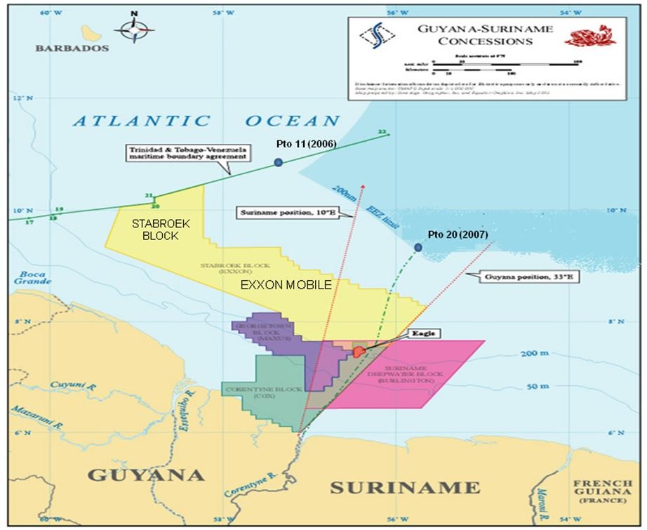 En particular el Ministerio de Energía y Minas planteó la necesidad de evaluar una Comunicación enviada por la empresa EXXON Mobil, en la cual hace consideraciones y solicita aclaratoria sobre las condiciones que acarreará la realización de operaciones en el Bloque 5, específicamente en la Controversia Territorial con Guyana, país que otorgó concesiones en el Bloque Starbroek[30].