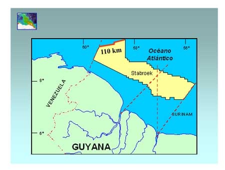 De acuerdo con declaraciones formuladas al diario Stabroek News por Newel Dennison, Director de Petróleo de la Comisión de Geología y Minas (GGMC),”la compañía EXXON está realizando los estudios correspondientes para conocer la factibilidad de que existan reservas de petróleo en cantidades comerciales en una cuenca submarina ubicada en aguas que estaban en disputa con Surinam, controversia dirimida en septiembre de 2007 por el Tribunal Internacional del Derecho del Mar, cuyo fallo supuestamente favorece a Guyana y le da derechos sobre dicha área[9].